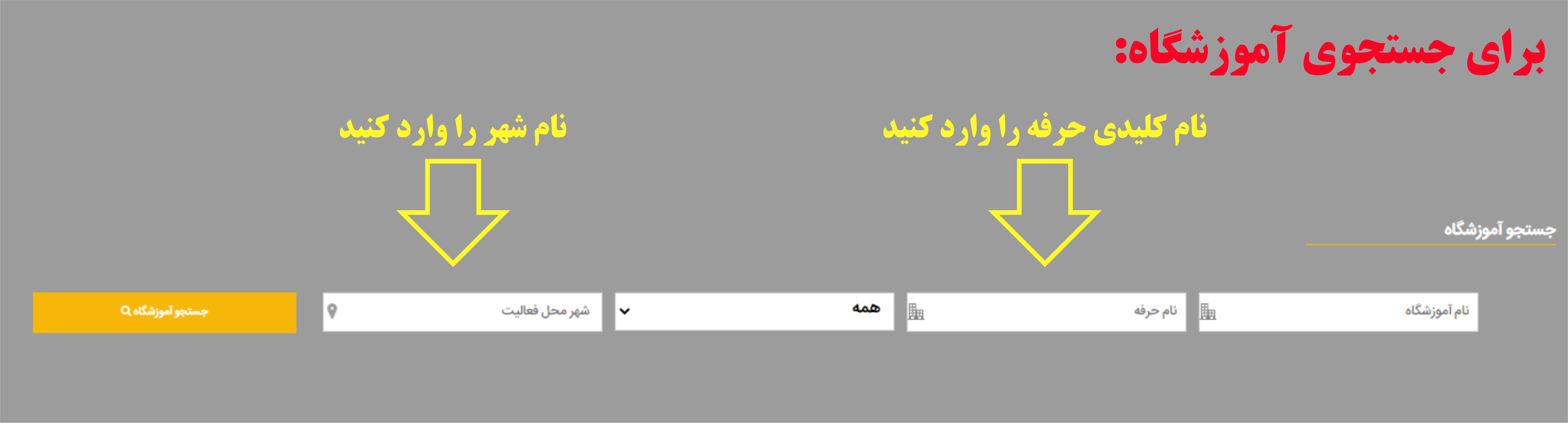 2 - افراد جویای مهارت : برای  جستجوی آموزشگاه  شهر و یک کلمه کلیدی از حرفه خود در قسمت حرفه وارد و کلید جستجو را فشار دهید